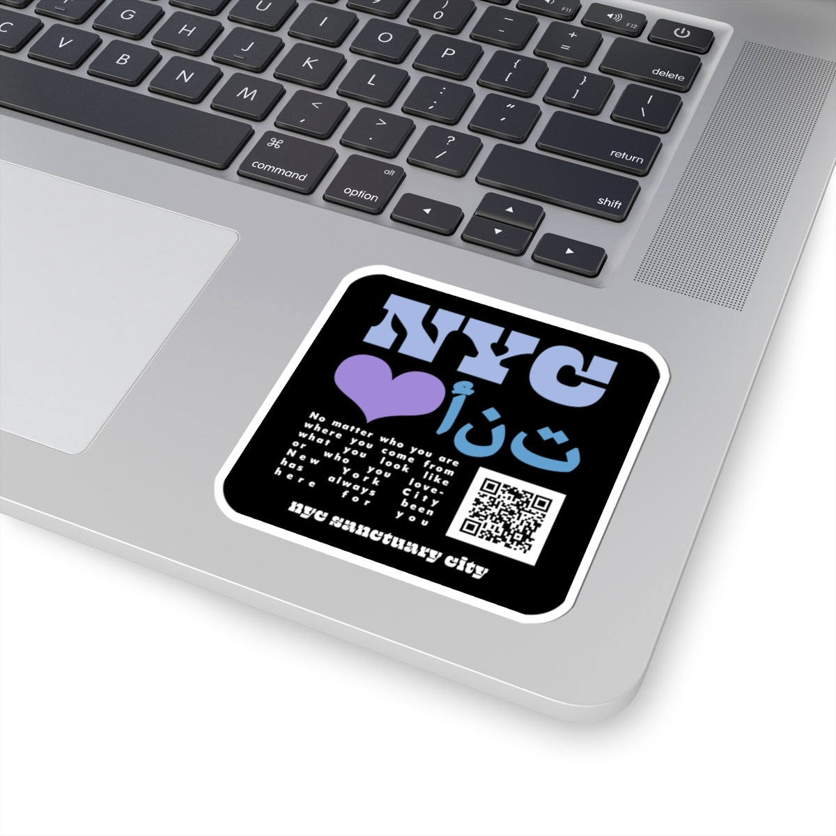 The NYC Heart You sanctuary city stickers are designed to promote immigrant solidarity and community support while proudly affirming New York City’s commitment as a sanctuary city. Available in seven of the many languages spoken in New York City, this Arabic language sticker is 3 inches x 3 inches, perfect for laptops, water bottles and other personal items.